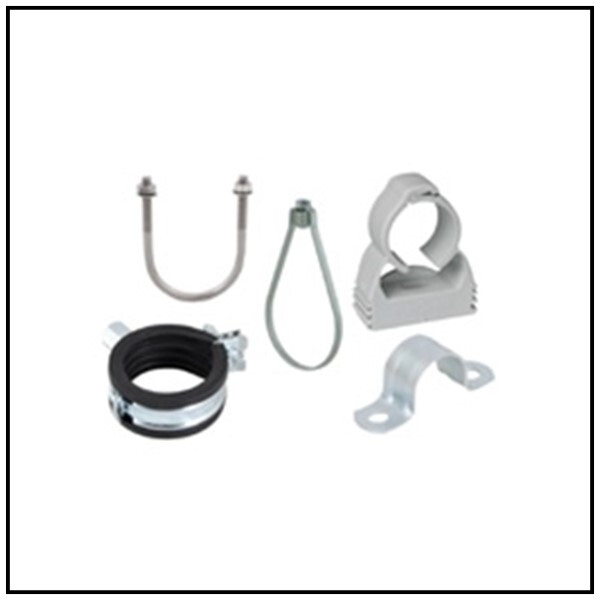 Galvanized clamps, pipe straps, clevis hangers, wall brackets, and support stays.
